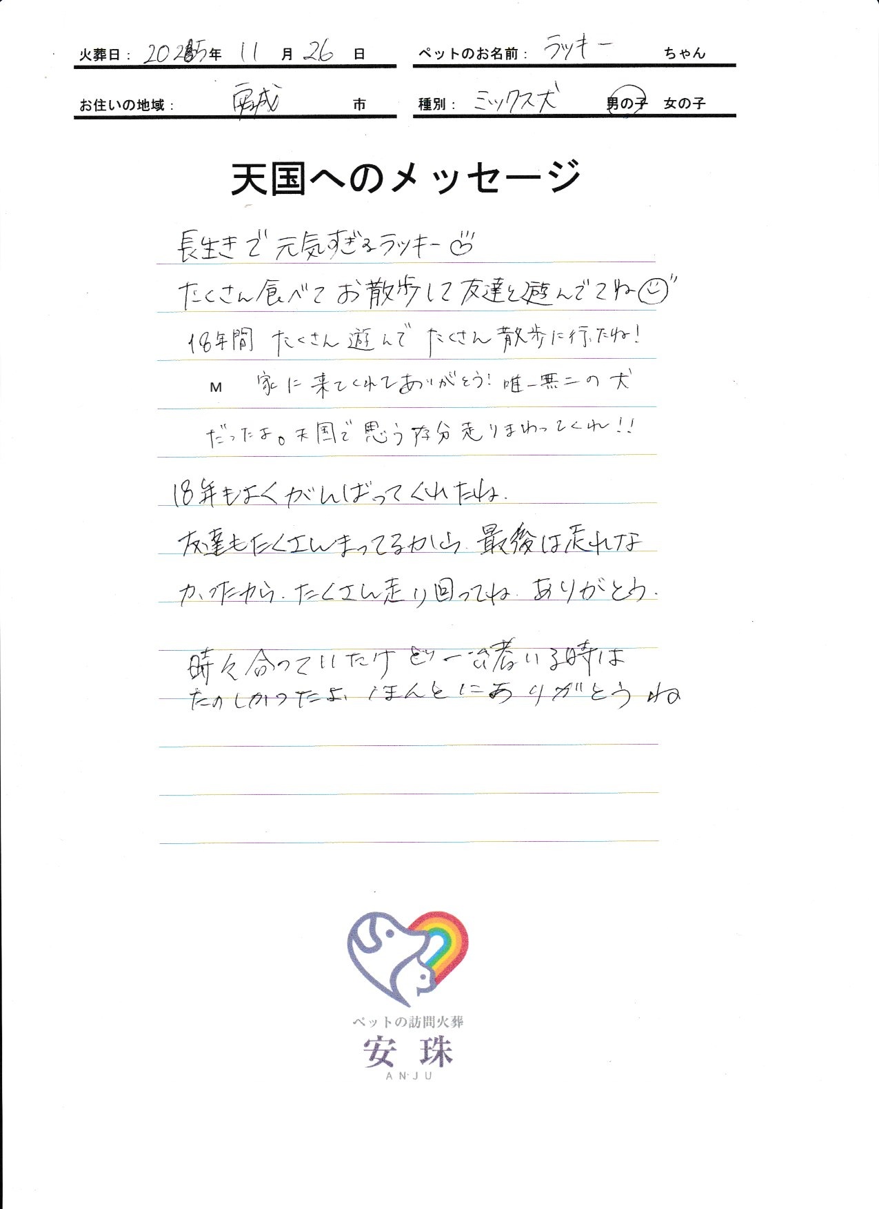 長生きで 元気すぎるラッキー♡たくさん食べてお散歩して友達と遊んでてね🌞18年間 たくさん遊んで たくさん散歩に行ったね!M家に来てくれてありがとう!唯一無二の犬だったよ。天国で思う存分走りまわってくれ!!18年もよくがんばってくれたね。友達もたくさんまってるから、最後は走れなかったから、たくさん走り回ってね。ありがとう。時々合っていたけど一緒いる時はたのしかったよ、ほんとにありがとうね