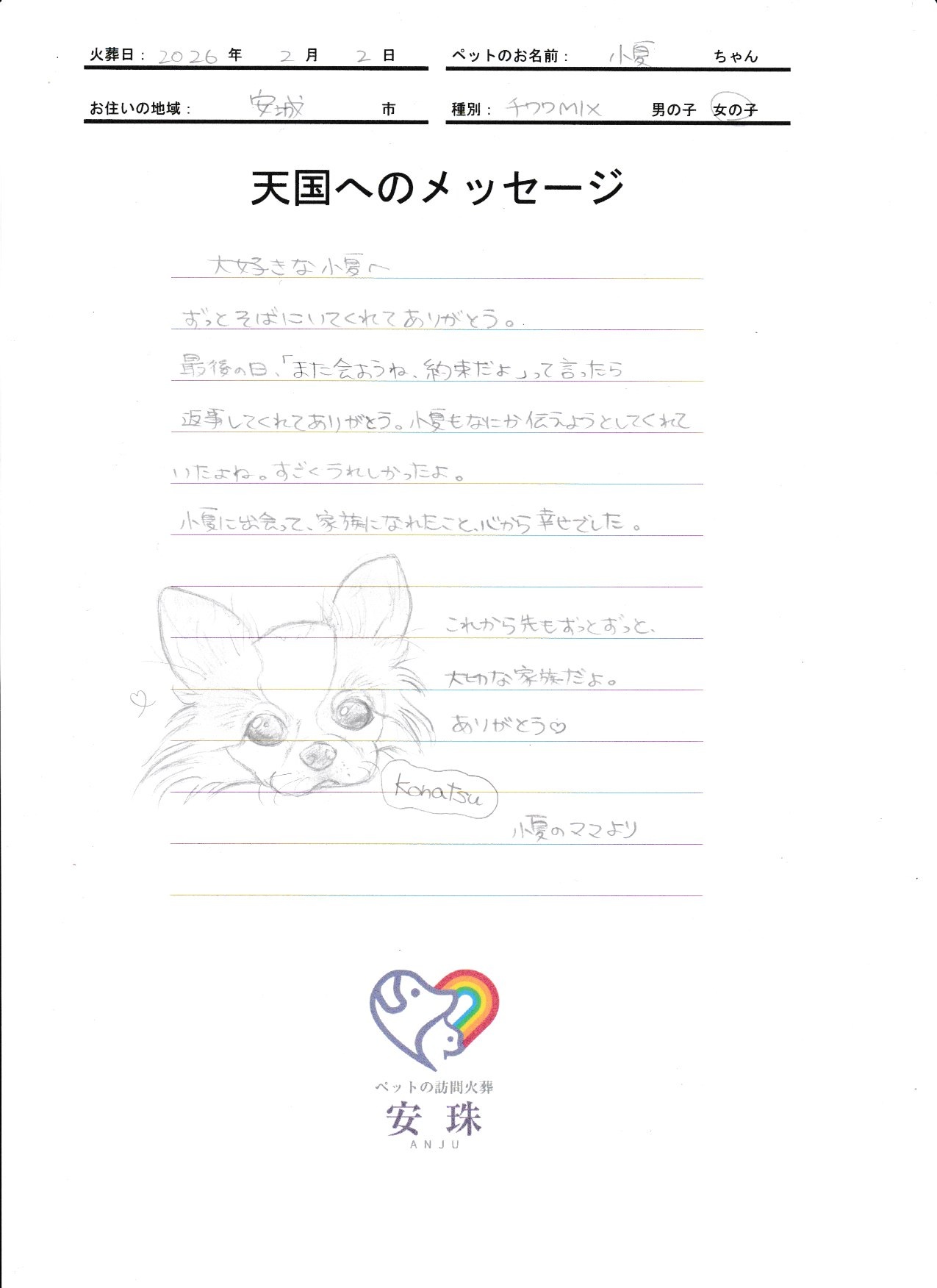 大好きな小夏へ ずっとそばにいてくれてありがとう。最後の日、「また会おうね、約束だよ」って言ったら 返事してくれてありがとう。小夏もなにか伝えようとしてくれていたよね。すごくうれしかったよ。小夏に出会って、家族になれたこと、心から幸せでした。これから先もずっとずっと、大切な家族だよ。ありがとう♡小夏のママより