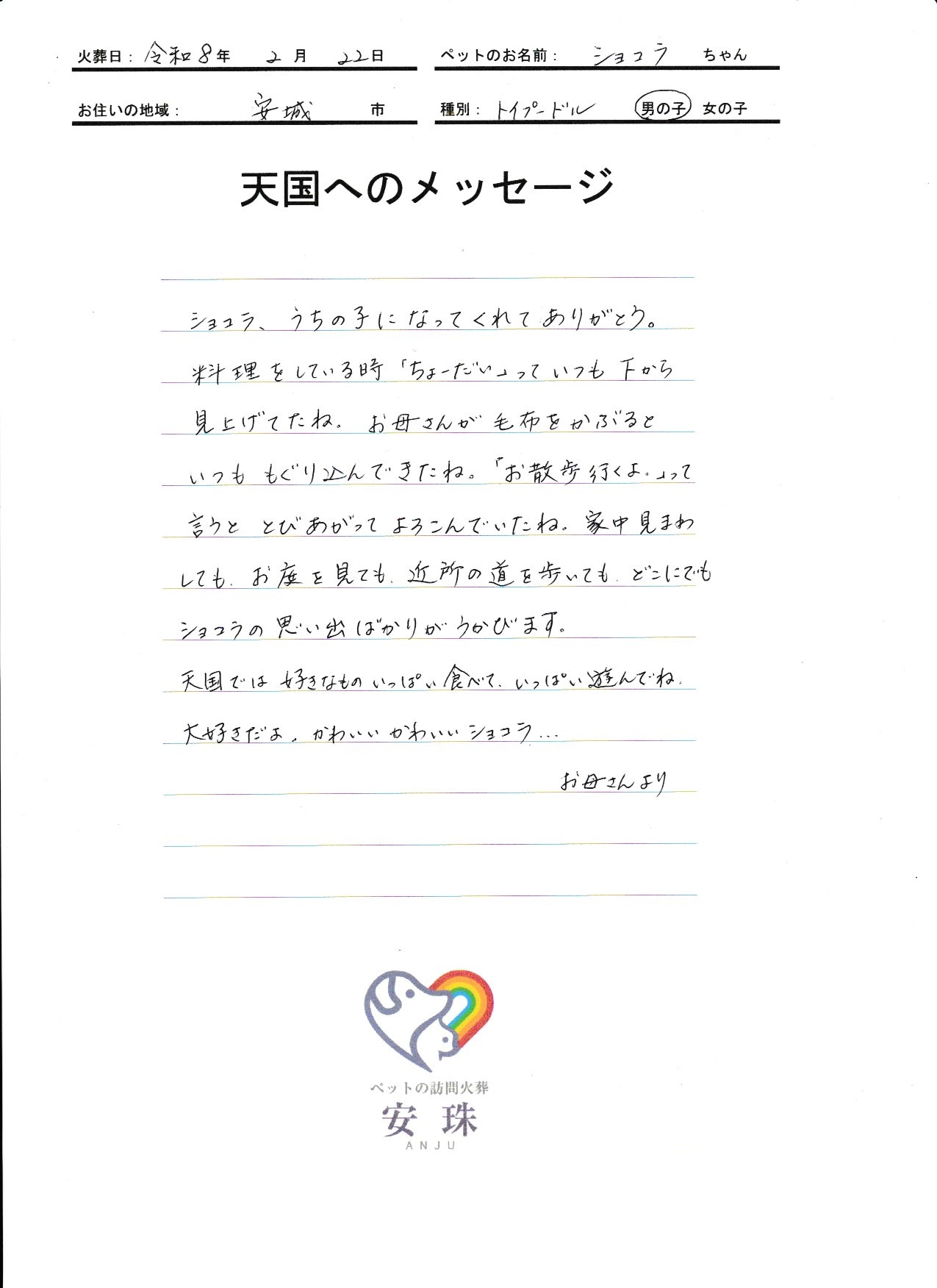 ショコラ、うちの子になってくれてありがとう。料理をしている時 「ちょーだい」って いつも 下から見上げてたね。お母さんが 毛布をかぶると いつも もぐり込んできたね。「お散歩行くよ。」って言うと とびあがって よろこんでいたね。家中 見まわしても、お庭を見ても、近所の道を歩いても、どこにでも ショコラの思い出ばかりが うかびます。天国では 好きなもの いっぱい食べて、いっぱい遊んでね。大好きだよ。かわいい かわいい ショコラ・・・お母さんより