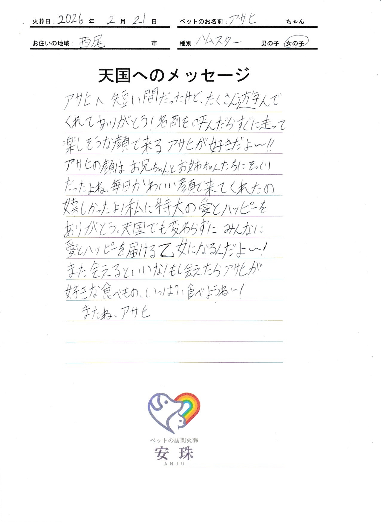 アサヒへ 短い間だったけど、たくさん遊んでくれてありがとう!名前を呼んだらすぐに走って 楽しそうな顔で来るアサヒがすきだよー!!アサヒの顔は お兄ちゃんとお姉ちゃんたちに そっくりだったよね、毎日かわいい顔で来てくれたの 嬉しかったよ!私に特大の愛とハッピーをありがとう。天国でも変わらずに みんなに 愛とハッピーを届ける乙女になるんだよー!また会えるといいな!もし会えたら アサヒが好きな食べもの、いっぱい食べようねー!またね、アサヒ