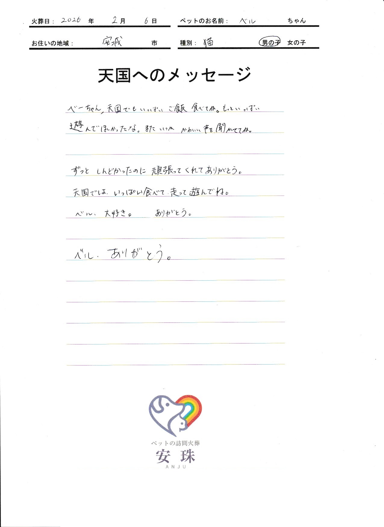 ベーちゃん、天国でもいっぱい ご飯食べてね。もっと いっぱい遊んでほしかったな。また いつか かわいい声を聞かせてね。 ずっと しんどかったのに 頑張ってくれてありがとう。 天国では、いっぱい食べて、走って遊んでね。 ベル、大好き。 ありがとう。 ベル、ありがとう。