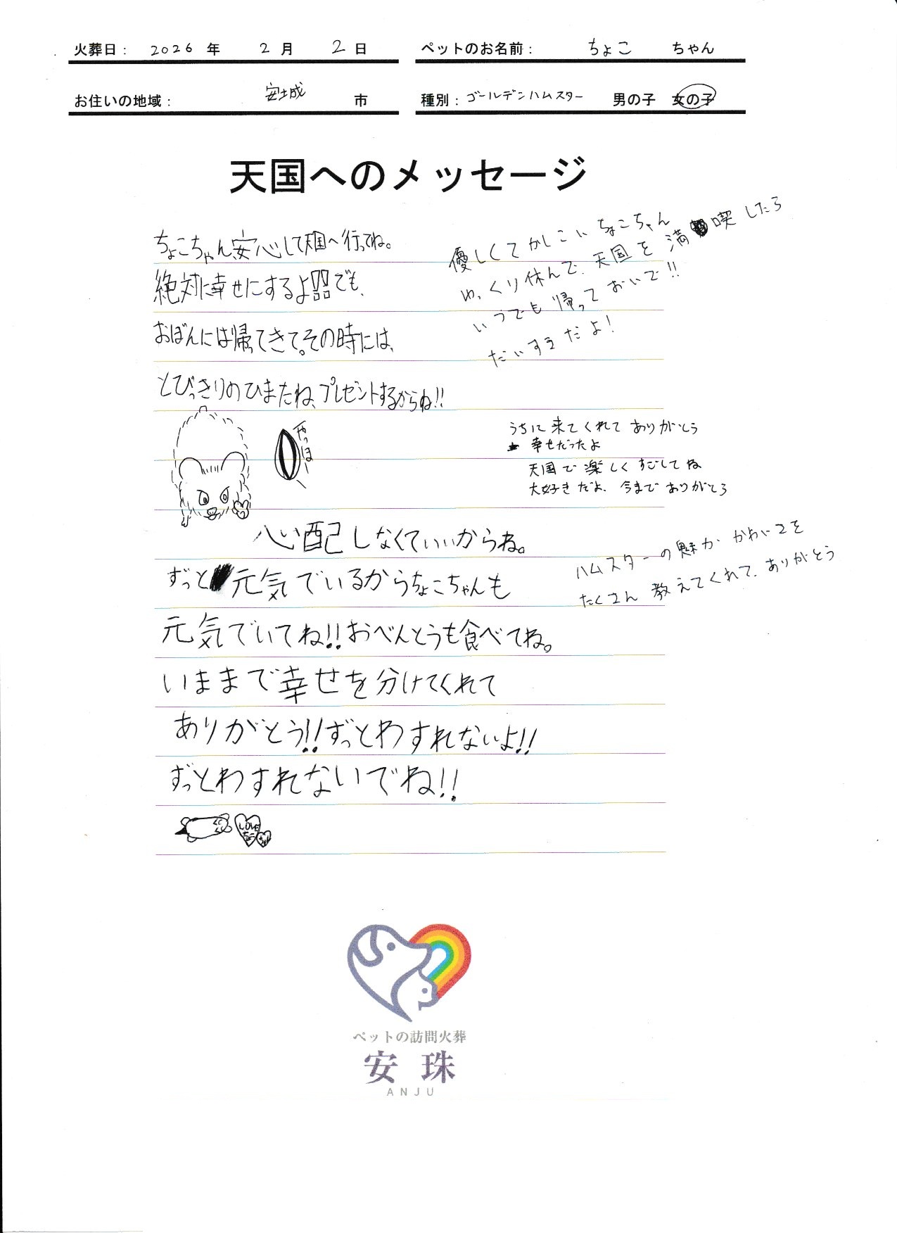 ちょこちゃん、安心して天国へ行ってね。絶対に幸せにするよ!!でも、おぼんには帰ってきて。その時には、とびっきりの ひまたね、プレゼントするからね!! 心配しなくていいからね。ずっと元気でいるから ちょこちゃんも元気でいてね!!おべんとうも食べてね。いままで幸せを分けてくれてありがとう!!ずっとわすれないよ!!ずっとわすれないでね!! 優しくて かしこいちょこちゃん ゆっくり休んで、天国を満喫したら いつでも帰っておいで!!だいすきだよ! うちに来てくれてありがとう 幸せだったよ 天国で楽しくすごしてね 大好きだよ、今までありがとう ハムスターの魅力 かわいさを たくさん教えてくれて、ありがとう