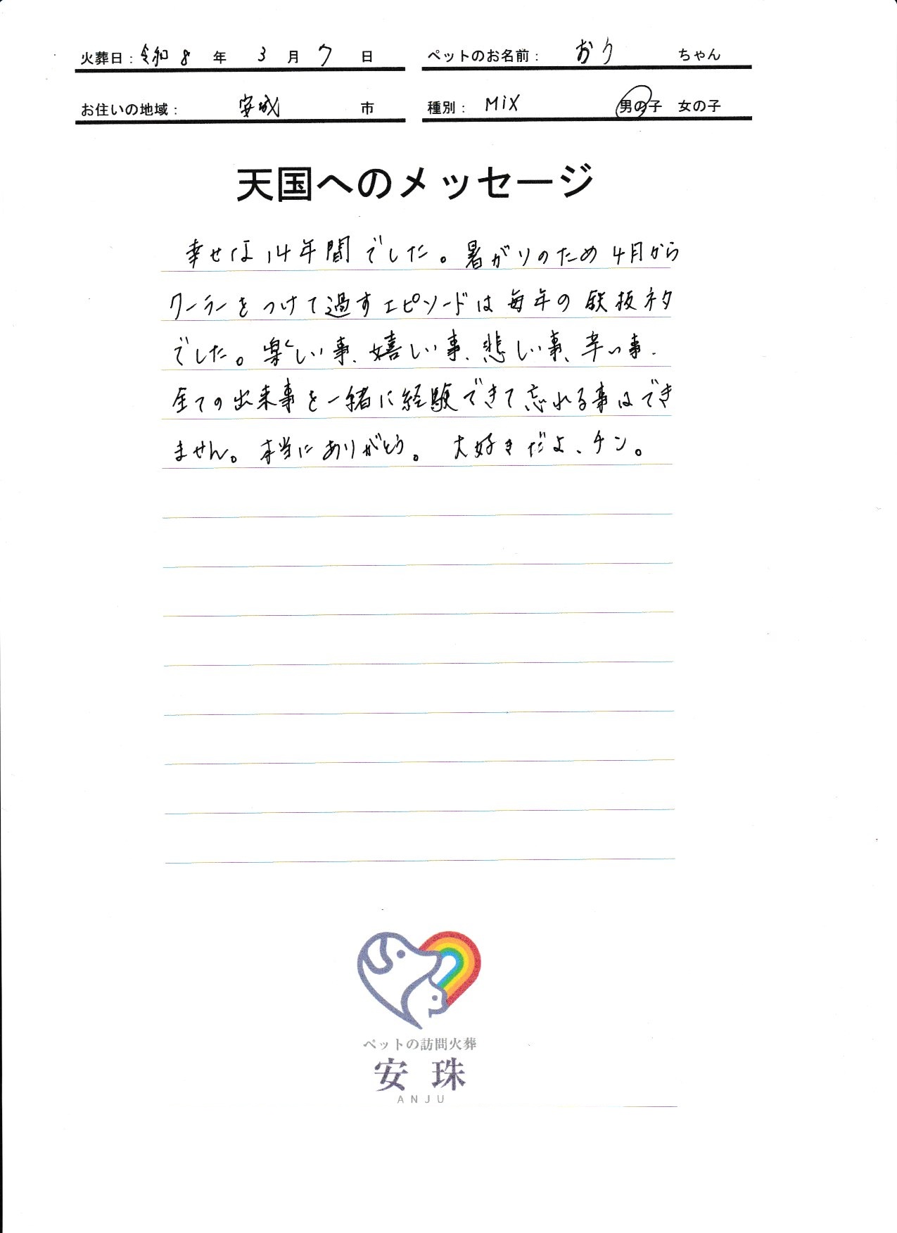 幸せな14年間でした。暑がりのため 4月からクーラーをつけて過すエピソードは 毎年の鉄板ネタでした。楽しい事、嬉しい事、悲しい事、辛い事、全ての出来事を一緒に経験できて 忘れる事はできません。本当にありがとう。大好きだよ、チン。