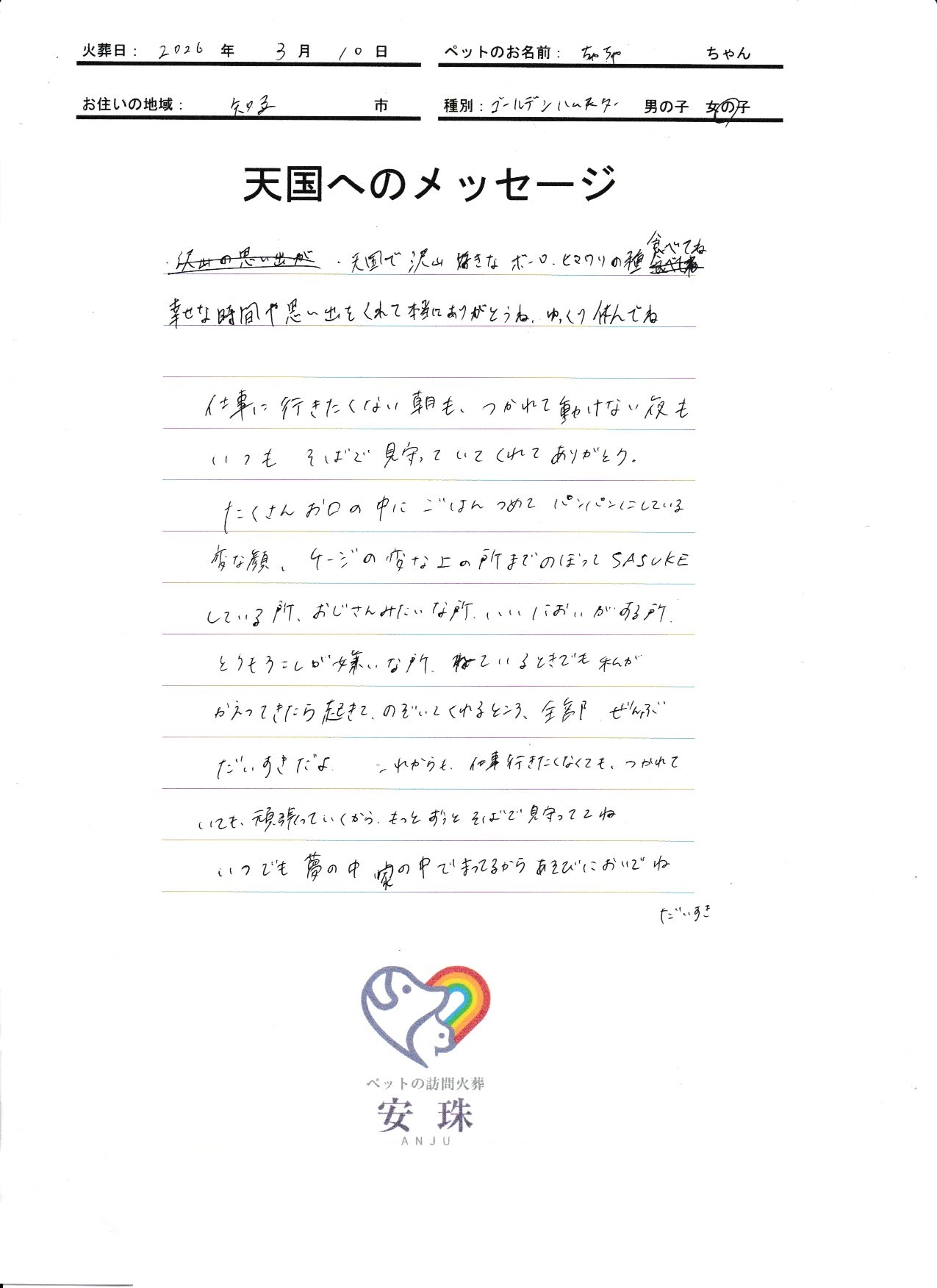天国で沢山 好きな ボーロ、ヒマワリの種 食べてね 幸せな時間や思い出をくれて本当にありがとうね、ゆっくり休んでね。 仕事に行きたくない朝も、つかれて動けない夜も いつも そばで見守っていてくれて ありがとう。たくさんお口の中に ごはん つめて パンパンにしている変な顔、ケージの変な上の所まで のぼって SASUKE している所、おじさんみたいな所、いいにおいがする所、とうもろこしが嫌いな所、ねているときでも 私が かえってきたら起きて、のぞいてくれるところ、全部 ぜんぶ だいすきだよ。これからも、仕事行きたくなくても、つかれていても、頑張っていくから、もっと ずっと そばで見守っててね。いつでも 夢の中 家の中でまってるからあそびにおいでね だいすき