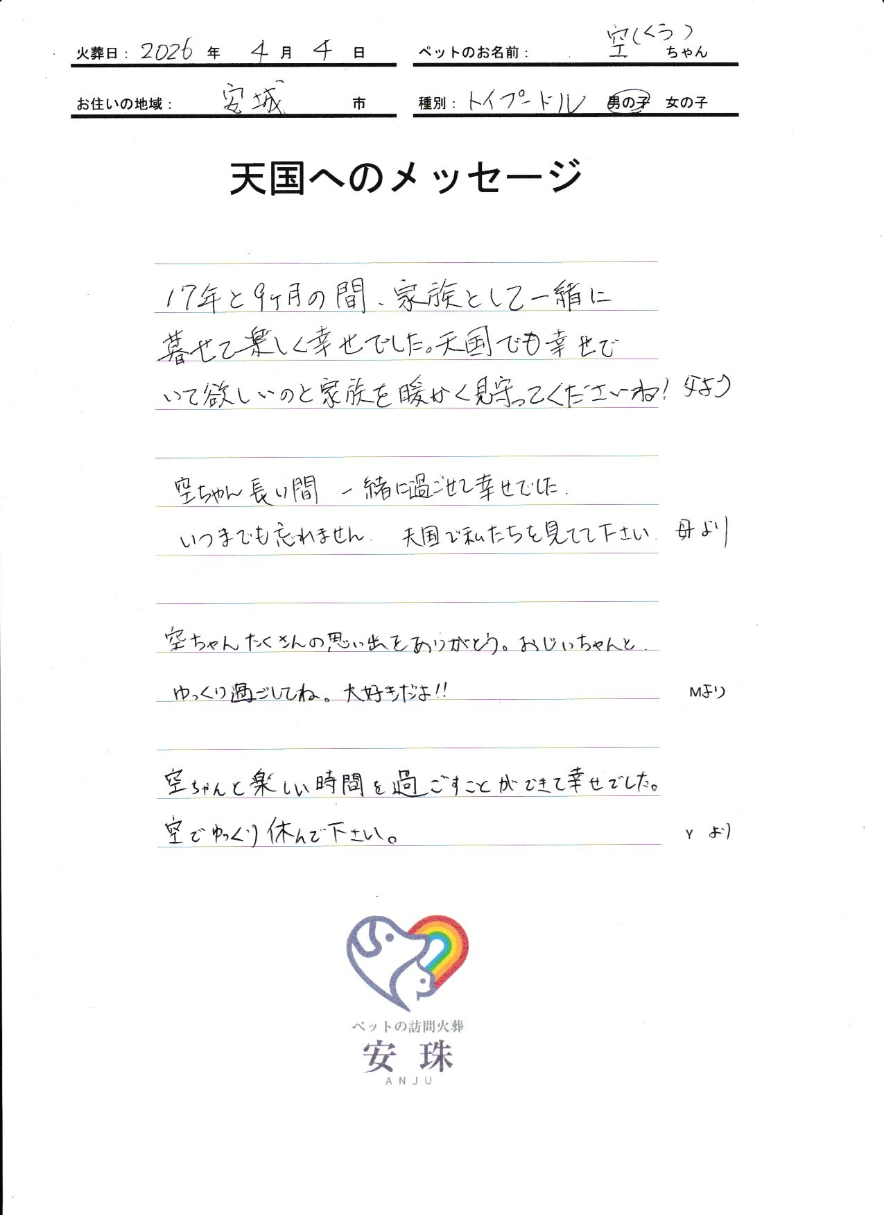 17年と9カ月の間、家族として一緒に暮せて楽しく幸せでした。天国でも幸せでいて欲しいのと家族を暖かく見守ってくださいね。父より 空ちゃん長い間 一緒に過ごせて幸せでした。いつまでも忘れません。天国で私たちを見てて下さい。母より 空ちゃん たくさんの思い出をありがとう。おじいちゃんと、ゆっくり過ごしてね。大好きだよ!!Mより 空ちゃんと楽しい時間を過ごすことができて幸せでした。空でよっくり休んで下さい。Yより