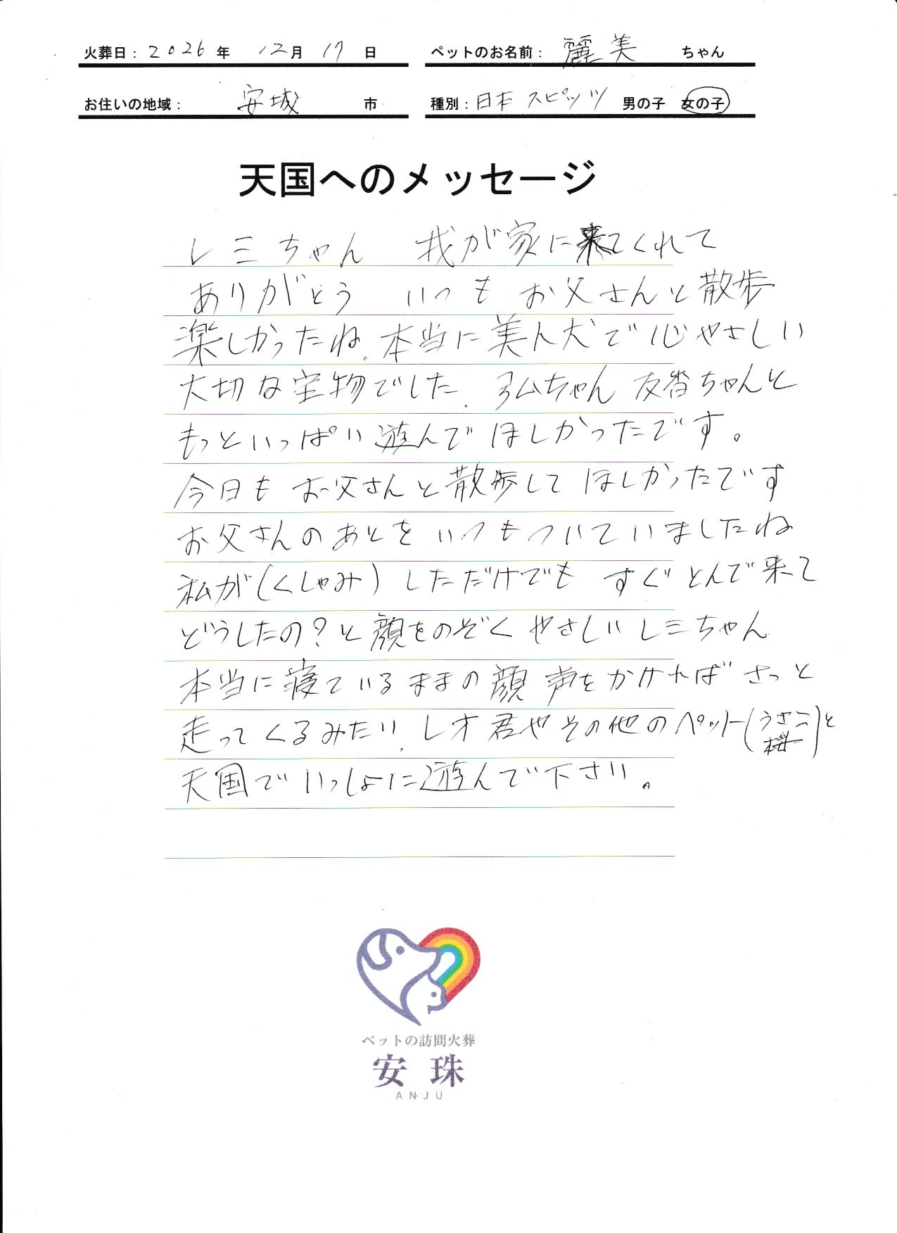 レミちゃん 我が家に来てくれてありがとう いつも お父さんと散歩 楽しかったね。本当に美人犬で 心やさしい 大切な宝物でした。弘ちゃん 友香ちゃんと もっといっぱい遊んでほしかったです。今日もお父さんと散歩してほしかったです お父さんの あとを いつもついていましたね 私が(くしゃみ)しただけでも すぐ とんで来てどうしたの?と顔をのぞくやさしい レミちゃん 本当に寝ているままの顔 声をかければ さっと走ってくるみたい。レオ君や その他のペット(うさこ 桜)と天国でいっしょに遊んで下さい。