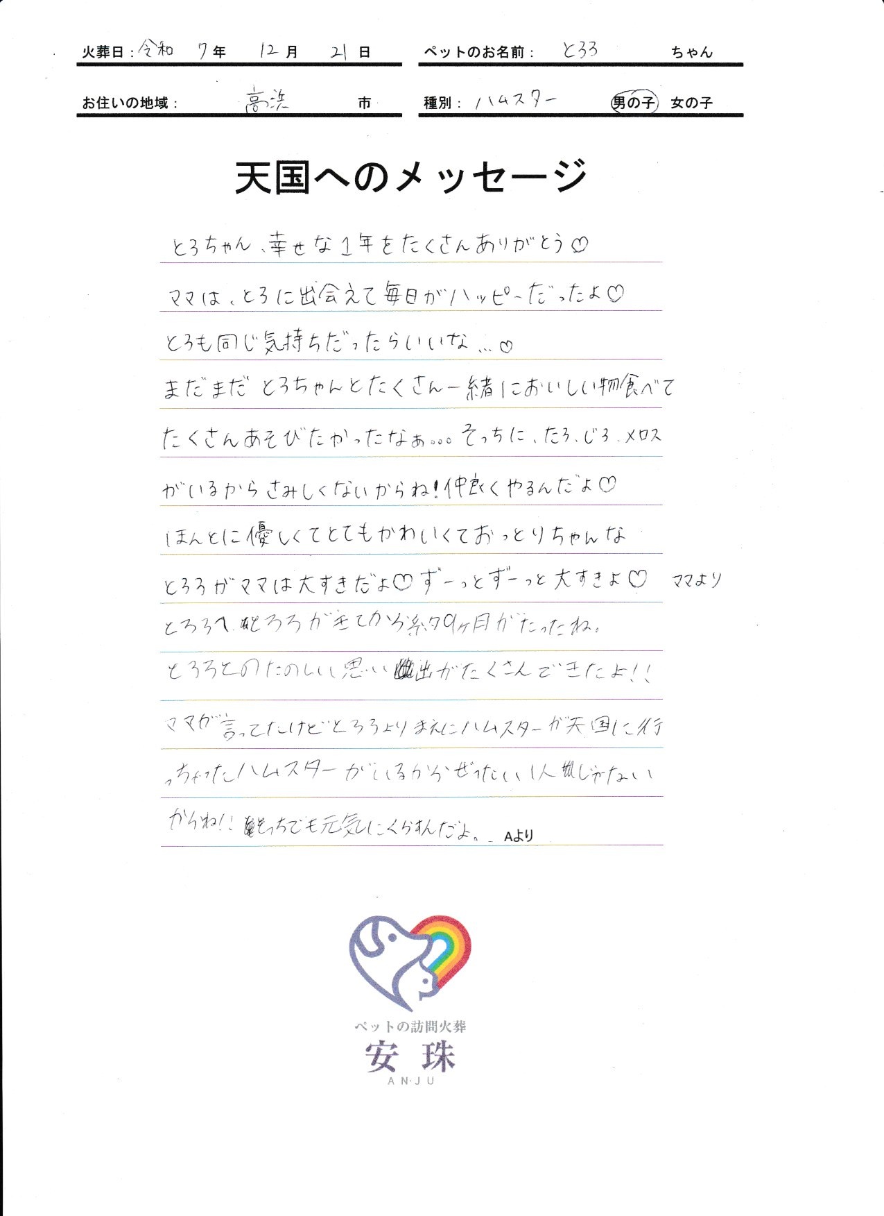 とろちゃん、幸せな1年をたくさんありがとう♡ママは、とろに出会えて毎日がハッピーだったよ♡とろも同じ気持ちだったらいいな、、、♡まだまだ とろちゃんとたくさん一緒においしい物食べて たくさんあそびたかったなぁ。。。そっちに、たろ、じろ、メロスがいるから さみしくないからね!仲良くやるんだよ♡ほんとに優しくて とてもかわいくておっとりちゃんな とろろがママは大すきだよ♡ずーっとずーっと大すきよ♡ママより とろろへ とろろがきてから約9カ月がたったね。とろろのたのしい思い出がたくさんできたよ!!ママが言ってたけど とろろよりまえに ハムスターが天国に行っちゃったハムスターがいるから ぜったい1人じゃないからね!!そっちでも元気にくらすんだよ。Aより