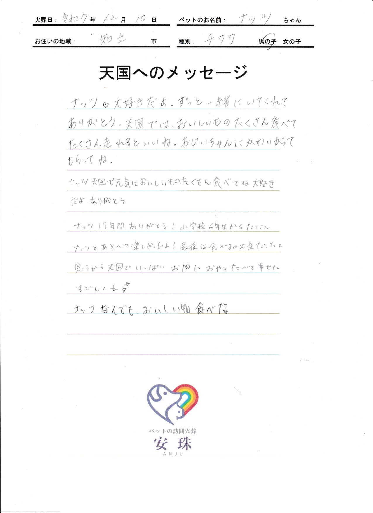 ナッツ♡大好きだよ。ずっと 一緒にいてくれてありがとう。天国では、おいしいものたくさん食べてたくさん走れるといいね。おじいちゃんに かわいがってもらってね。 ナッツ 天国で元気においしいものたくさん食べてね 大好きだよ、ありがとう ナッツ17年間ありがとう!小学校6年生から たくさん ナッツとあそべて楽しかったよ!最後は食べるの大変だったと思うから天国で いっぱい お肉におやつ たべて幸せにすごしてね✩✩ ナッツ なんでも、おいしい物食べな