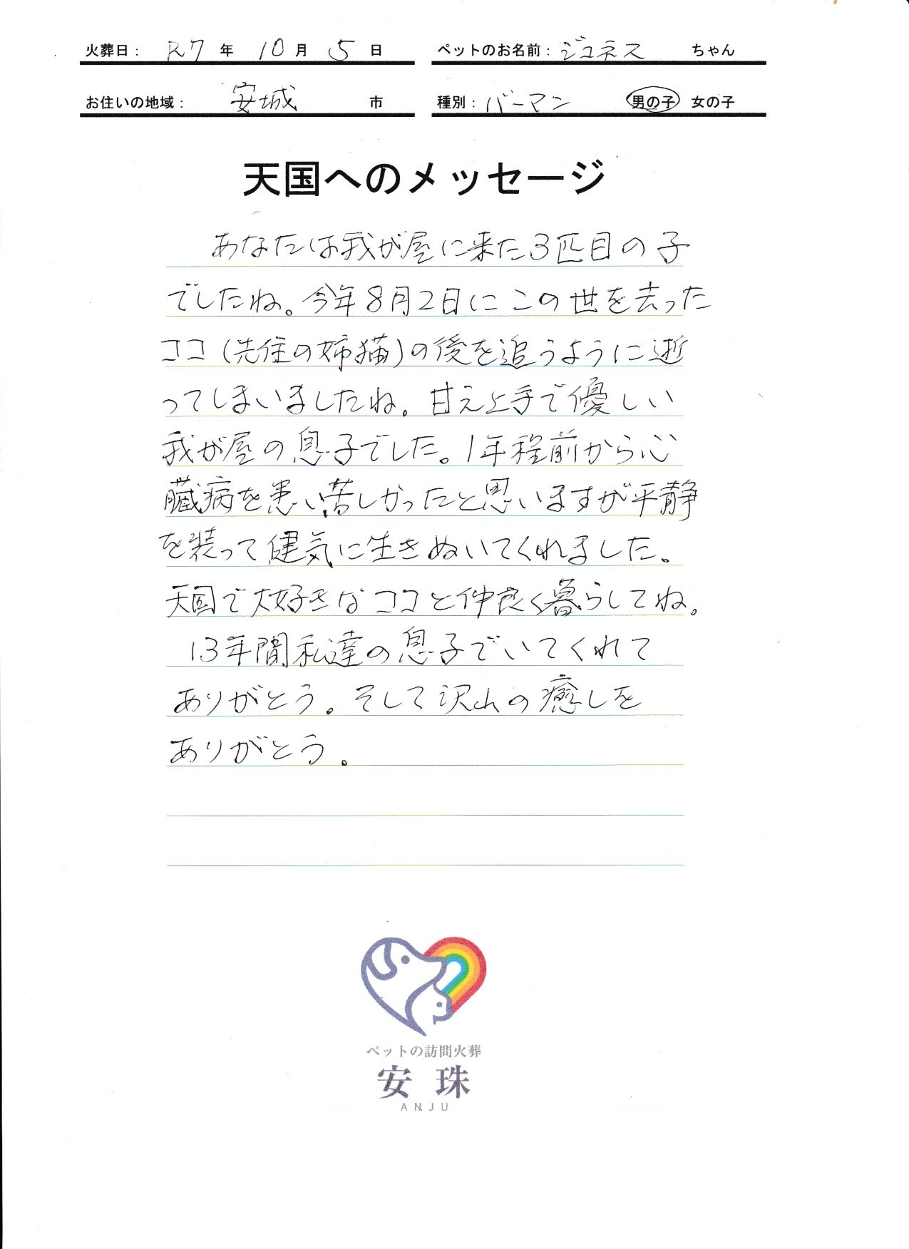 オレちゃんへ、 天国でもしあわせにすごしてください。大好きです。H。 おれちゃん いつもそばにいてくれてありがとう。C。 オレちゃん 7年間一緒に過ごしてくれてありがとう。食いしんぼうで おっとりしていて ちょっとどんくさい オレちゃんが大好きだよ。最後の一年は病気と戦ってつらいことが、たくさんあったけど天国ではゆっくりしてね。ママより 今までありがとう、また会おうね パパより