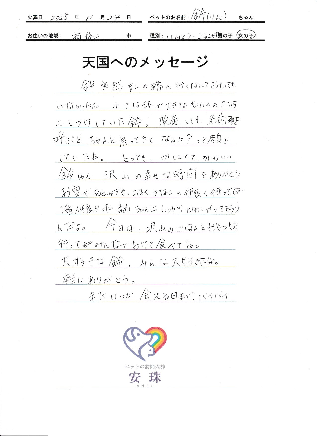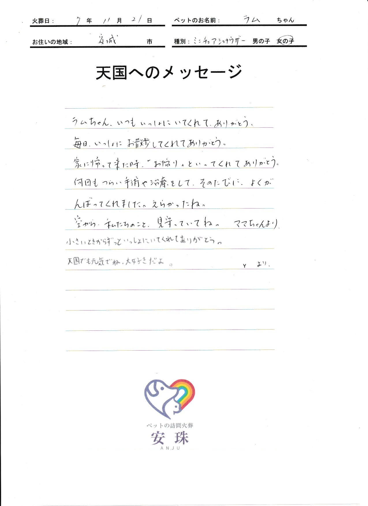 【天国へのメッセージ】 ラムちゃん、いつも いっしょにいてくれて、ありがとう。毎日、いっしょにお散歩してくれてありがとう。家に帰って来た時、「お帰り」といってくれてありがとう。何回もつらい手術や治療をして、そのたびに、よくがんばってくれました。えらかったね。空から、私たちのこと、見守っていてね。ママちゃんより ちいさいときから ずっといっしょにいてくれてありがとう。天国でも元気でね、大好きだよ。Yより