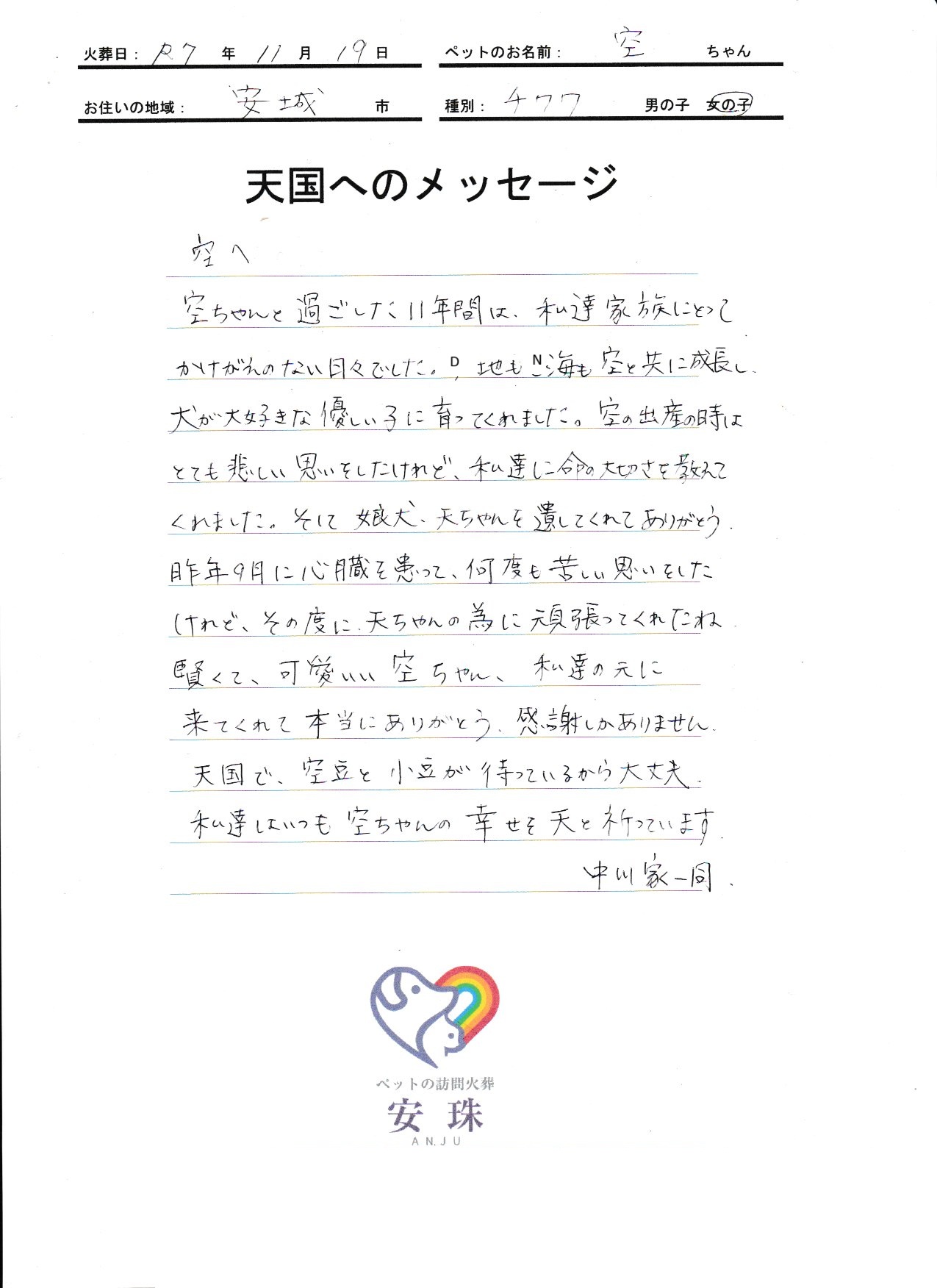 【天国へのメッセージ】 空へ 空ちゃんと 過ごした11年間は、私達家族にとって かけがえのない日々でした。D地もN海も空と共に成長し、犬が大好きな優しい子に育ってくれました。空の出産の時はとても悲しい思いをしたけれど、私達に命の大切さを教えてくれました。そして 娘犬、天ちゃんを遺してくれてありがとう。昨年9月に心臓を患って、何度も苦しい思いをしたけれど、その度に、天ちゃんの為に頑張ってくれたね。賢くて、可愛い空ちゃん、私達の元に来てくれて 本当にありがとう。感謝しかありません。天国で、空豆と小豆が待っているから大丈夫。私達はいつも 空ちゃんの 幸せを天と祈っています。中川家一同