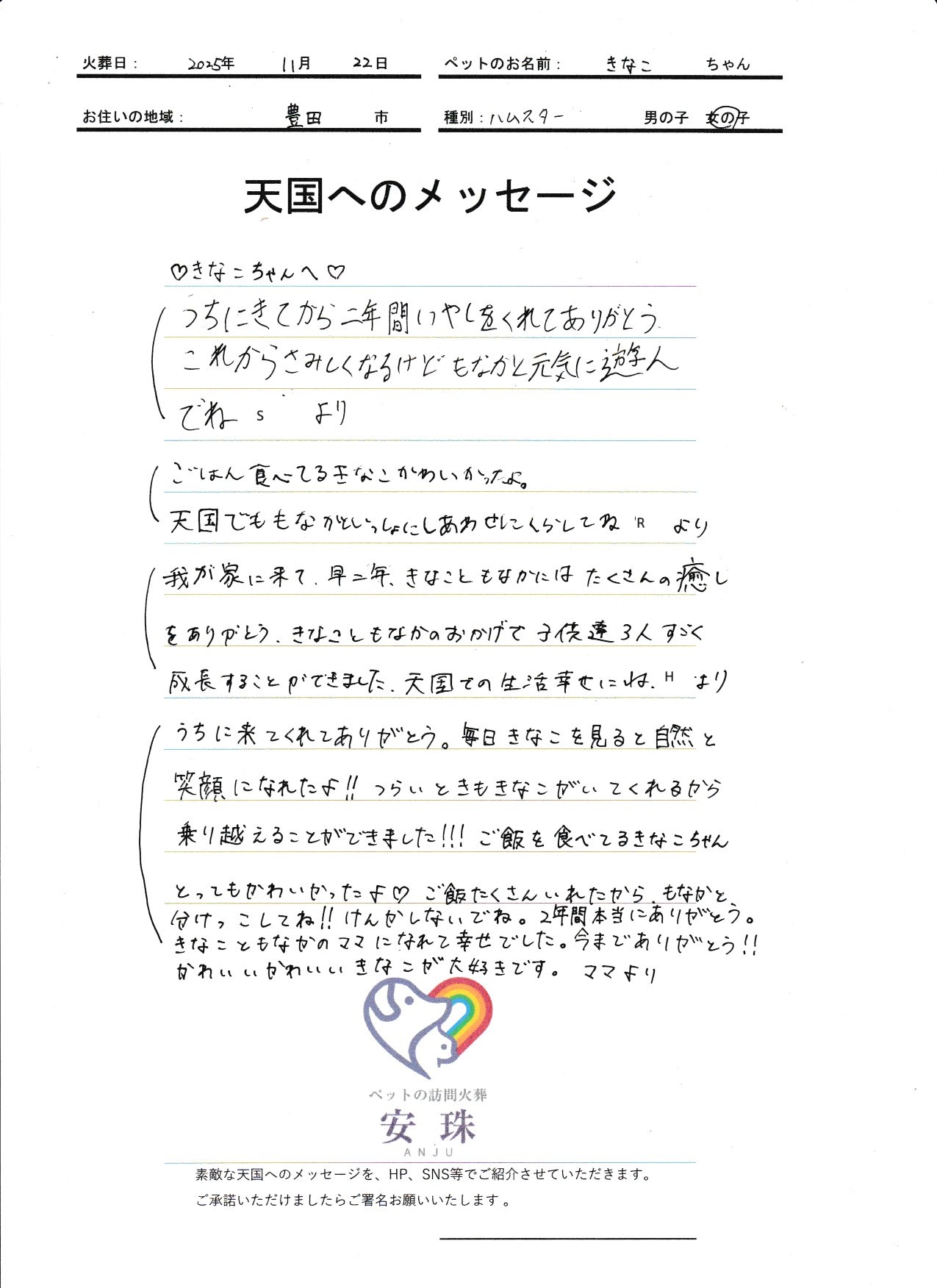 【天国へのメッセージ】 ♡きなこちゃんへ♡ うちにきてから二年間いやしをくれてありがとう。これからさみしくなるけど もなかと元気に遊んでね Sより ごはん食べてる きなこ かわいかったよ。天国でも もなかと いっしょに しあわせにくらしてね Rより 我が家に来て、早二年、きなこと もなかには たくさんの癒しをありがとう。きなこともなかのおかげで 子供達3人すごく成長することができました。天国での生活幸せにね。Hより うちに来てくれてありがとう。毎日きなこを見ると自然と笑顔になれたよ!!つらいときも きなこがいてくれるから乗り越えることができました!!!ご飯を食べてる きなこちゃん とってもかわいかったよ♡ご飯たくさんいれたから、もなかと分けっこしてね!!けんかしないでね。2年間本当にありがとう。きなこともなかのママになれて幸せでした。今までありがとう!!かわいい かわいい きなこが大好きです。ママより